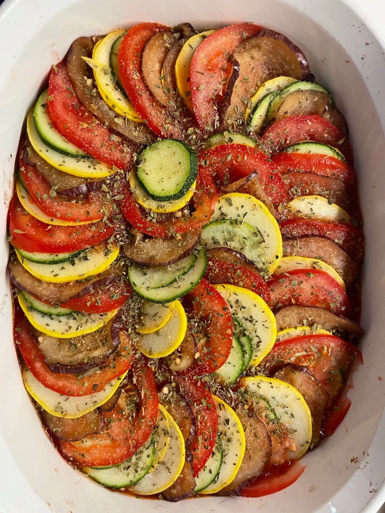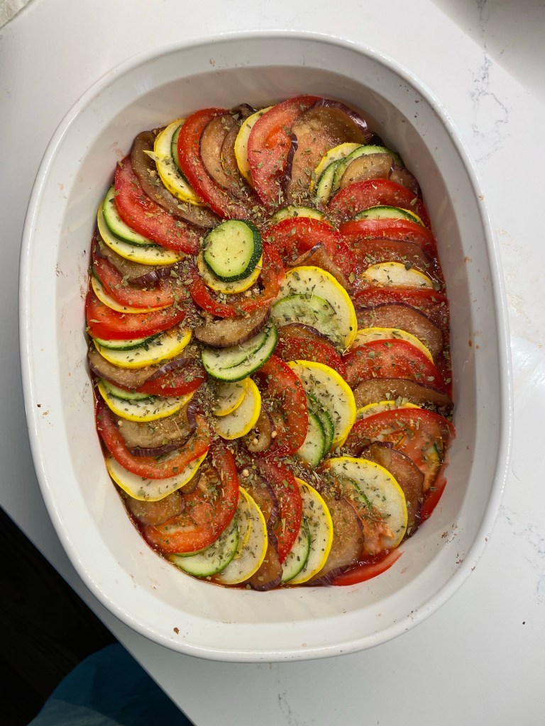 I don’t have a photo of it baked but after baking the tomato sauce covered it a little, I enjoyed this dish it’s a great way to use up veggies in the house!