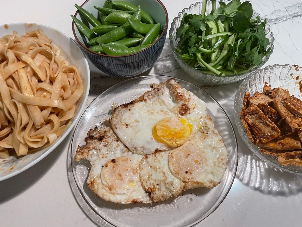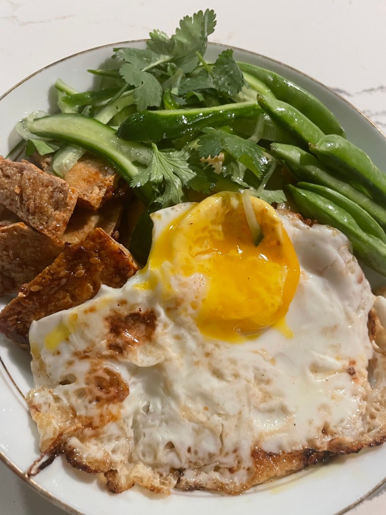 Tonight I needed to eat something refreshing so I made some fried tofu and seasoned it with a sweet sesame soy sauce, a cilantro and cucumber salad, fried eggs cooked in the leftover tofu sauce, and sugar snap peas 🫛! I seasoned the noodles with a soy peanut sauce as well. 🙃