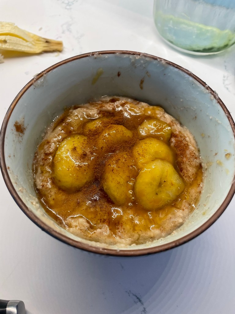 My current obsession is my oatmeal. I like to blend the oats and then I don’t measure anything so I just simmer it with water and milk, add a pinch of salt, maple syrup or honey, and last but not least I separately caramelized bananas and top it off with cinnamon!